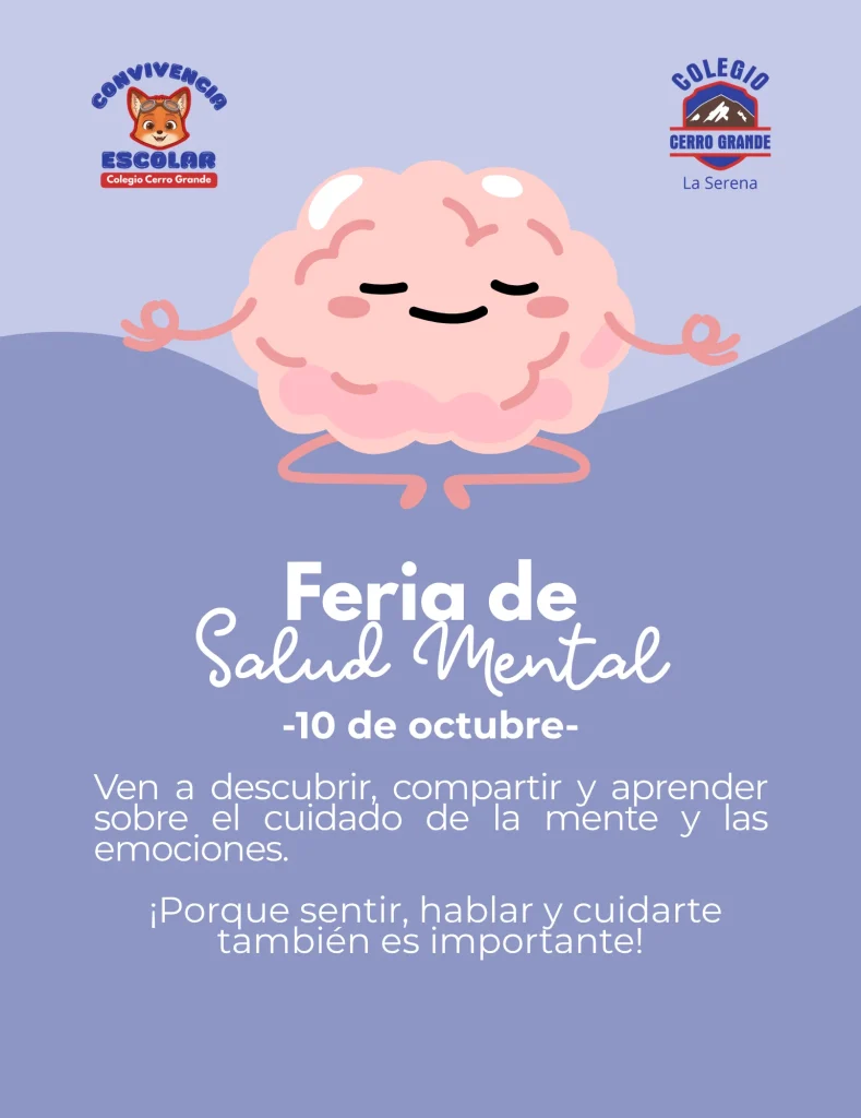 Por esta razón, el equipo de Convivencia Escolar invita a la comunidad educativa a participar en la Primera Feria de Salud Mental del Colegio Cerro Grande, que se realizará el 10 de octubre, en el marco de la conmemoración del Día Mundial de la Salud Mental.
